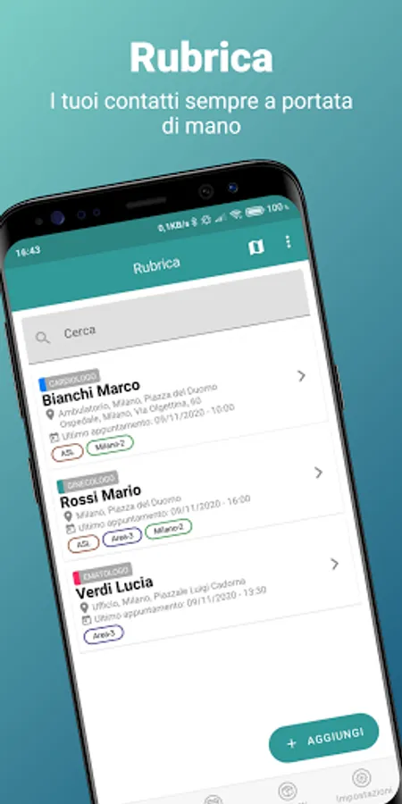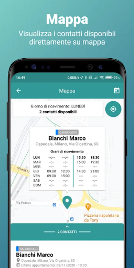 ✓ view contacts on the map based on the day of receipt of the week, identify those closest to your position and start browsing or make a new appointment;