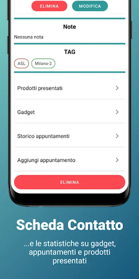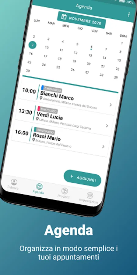 The purpose of the application is to simplify and facilitate the pharmaceutical sales representative in the management of their business, from the address book to appointments, up to the insertion of products.