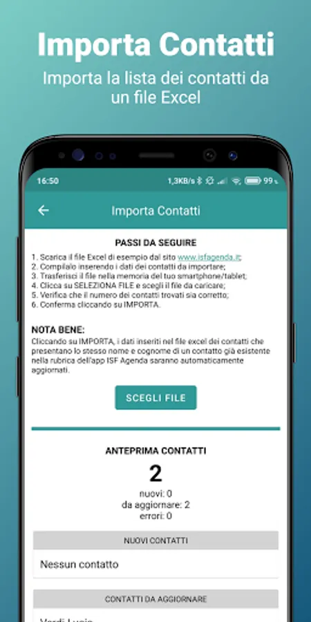 ✓ import of the address book from Excel file (template downloadable from the official website https://www.isfagenda.it)