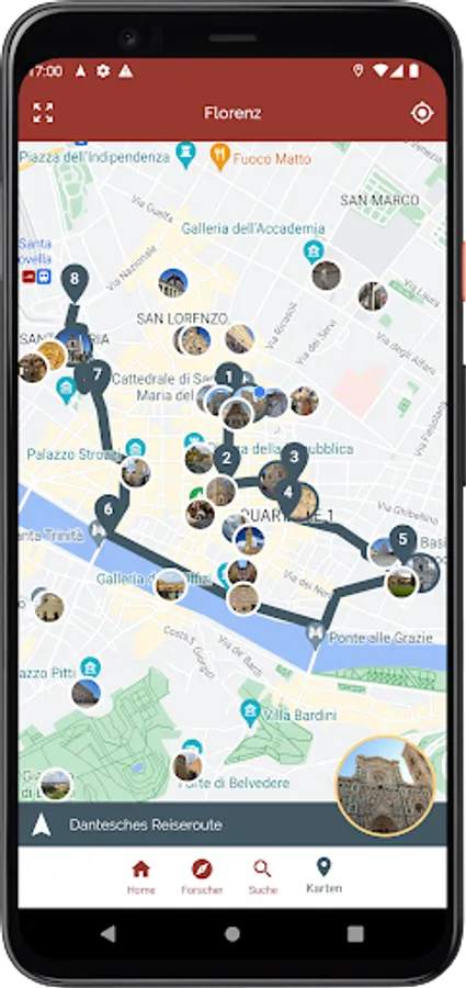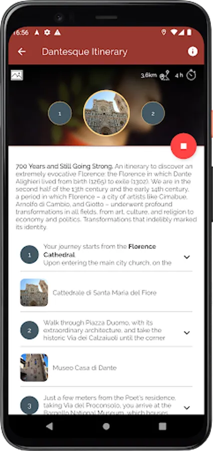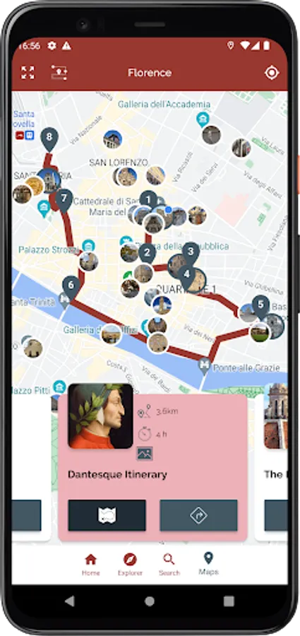 Choose from the available different routes that best suit your preferences and time available, start the navigator, and let yourself be guided to discover the beauties of this city.
