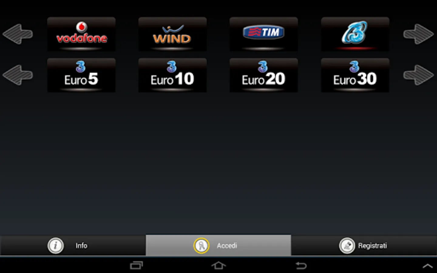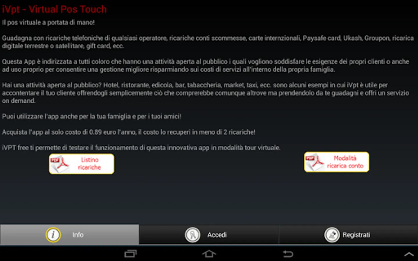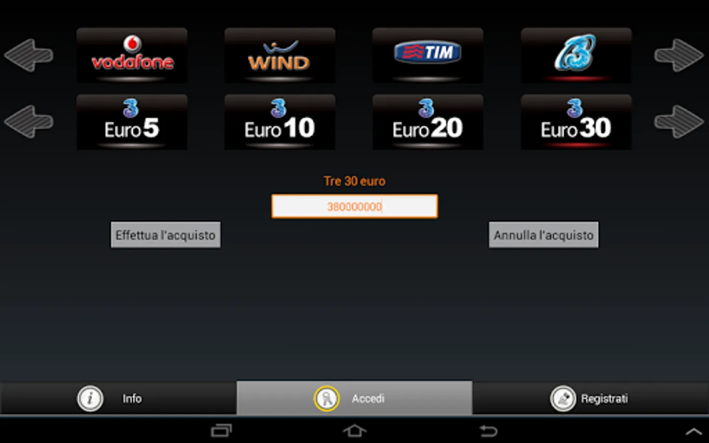This is Free version for demonstration purposes only. Earn money by selling BITCOIN and ALTCOIN, phone top-ups of any operator (Tim, Wind, Vodafone, Tre and PosteMobile), top-up betting accounts (Pokerstarts, BWin, William Hill, Digital Game), international cards, service cards, Paysafe card, Ukash, recharge digital terrestrial or satellite (Premium, Sky). This App is addressed to all those who have an activity open to the public who want to meet the needs of their customers. Do you have an activity open to the public? Hotel, restaurant, newsstand, bar, market, taxi, etc. are some examples where iVpt is useful to satisfy your customer by simply offering what he would buy elsewhere but by taking it from you earn and offer an on demand service.