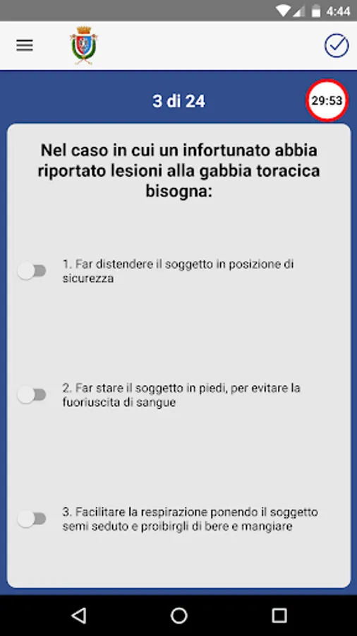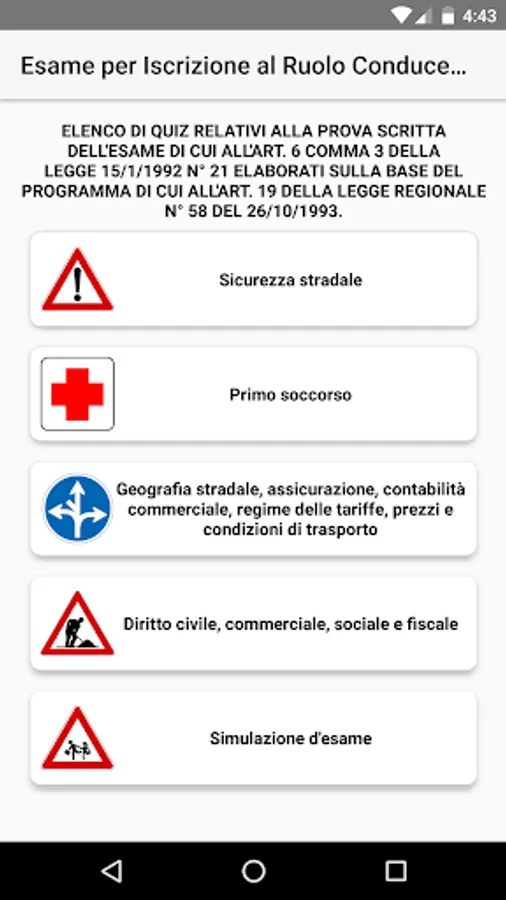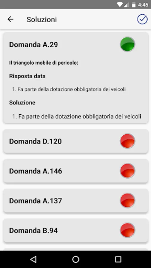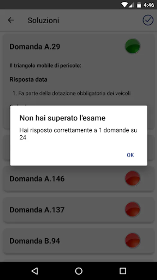 The most important function of the app is the exam simulation that consists of 24 questions to be answered in 30 minutes. Finally, you can view the outcome of the investigation.