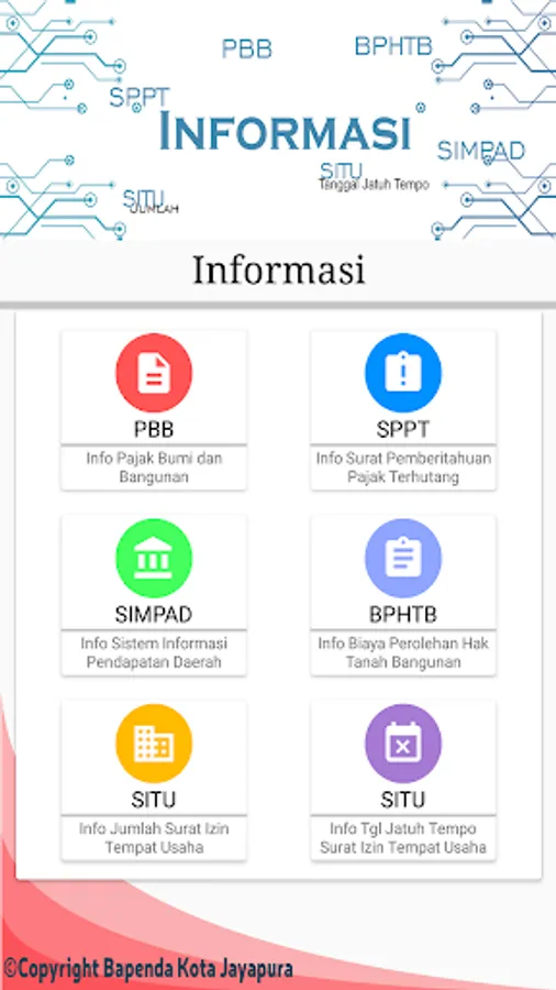 Aplikasi ini memberikan informasi kepada masyarakat mengenai History Pembayaran Pajak, Simulasi Tarif Pajak & Retribusi, informasi Persyaratan Pajak, Laporan Penerimaan, serta modul Pengaduan Masyarakat
