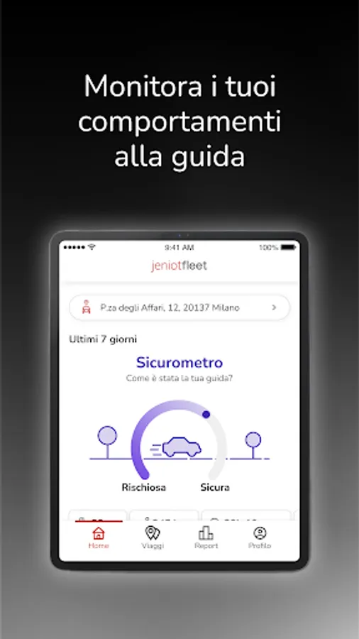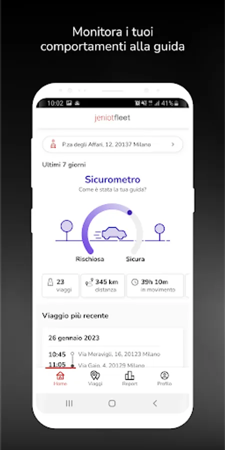 The jeniot fleet app dedicated to fleet drivers allows you to monitor driving safety and consult the details of the journeys made. The driver can access driving statistics and analyze each route on the map by interacting with it.