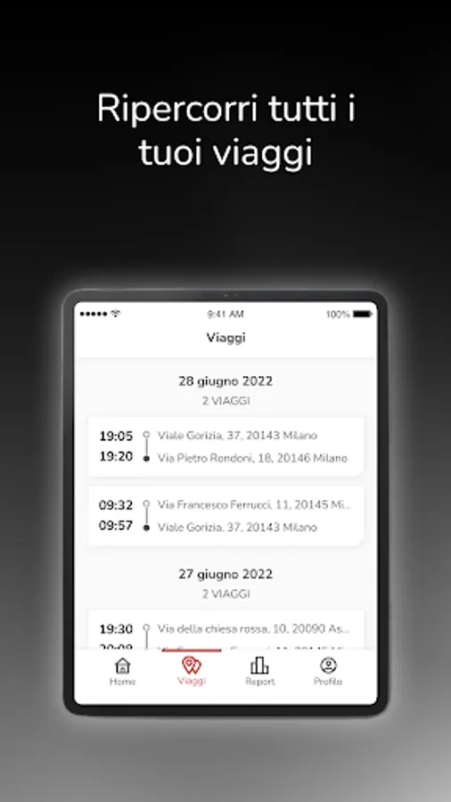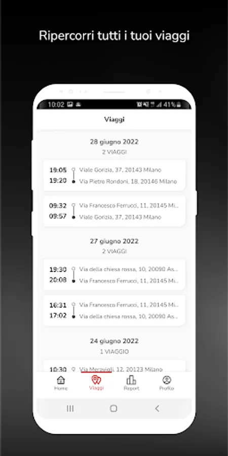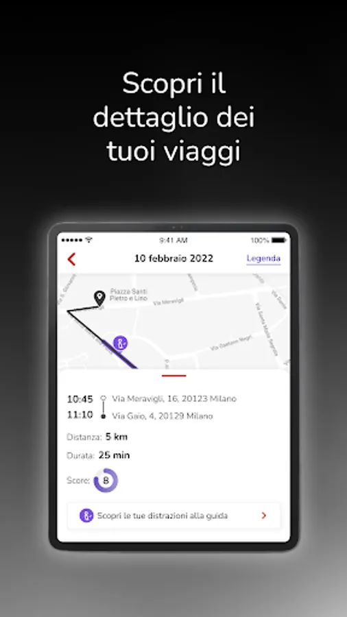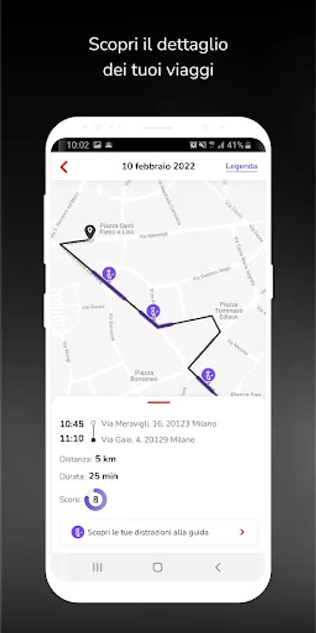 • Consult travel history — retrace your travels on the map, displaying the departure and arrival address, the score and other details