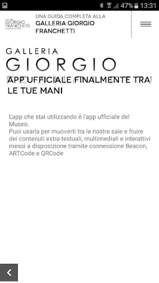Info, Promo, contents and interactive tours: the official Galleria Giorgio Fransceschetti app is the best way to completely enjoy the visitation of the museum. The app contains the official audioguides of the tour: just enable your bluetooth, get close to an art piece and receive contextual real-time contents from the art itself.