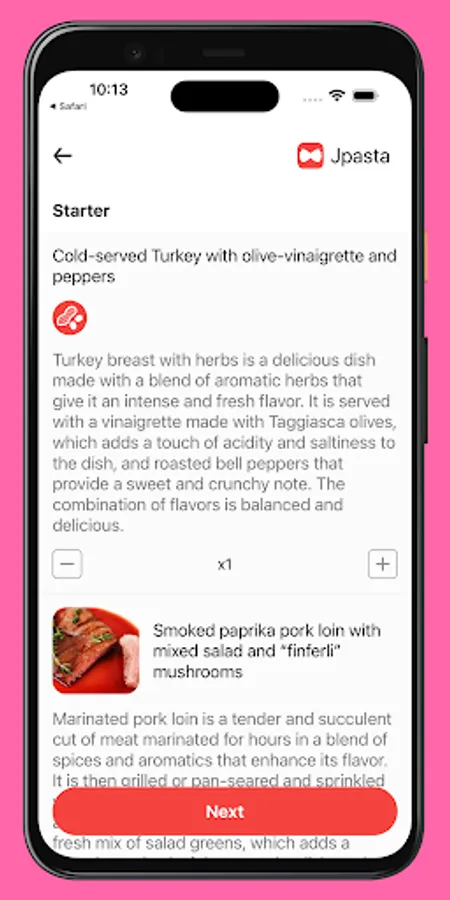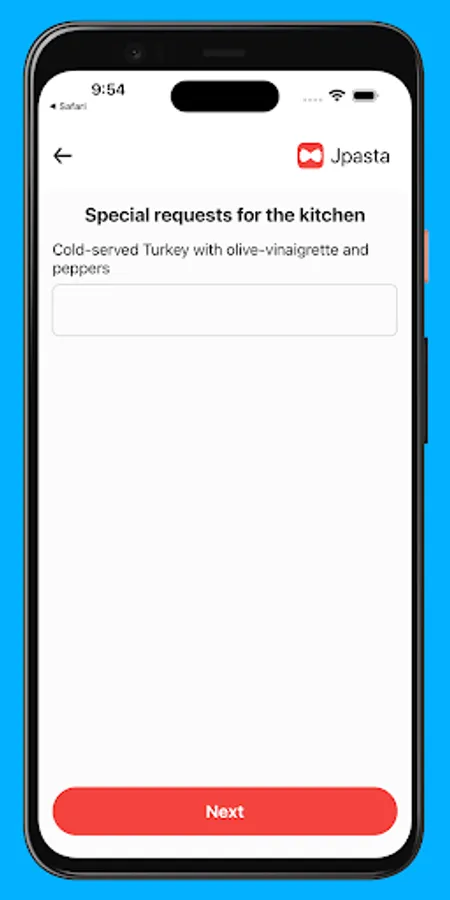 Order your meal with ease! Our app allows you to consult the menu of the hotel restaurant and choose the meal of your choice. You can specify your food preferences and indicate any other dietary needs, so our chef can prepare the perfect dish for you. The app allows you to order your meal quickly and easily. If you forget to order for a meal, Jpasta will remind you to do so.