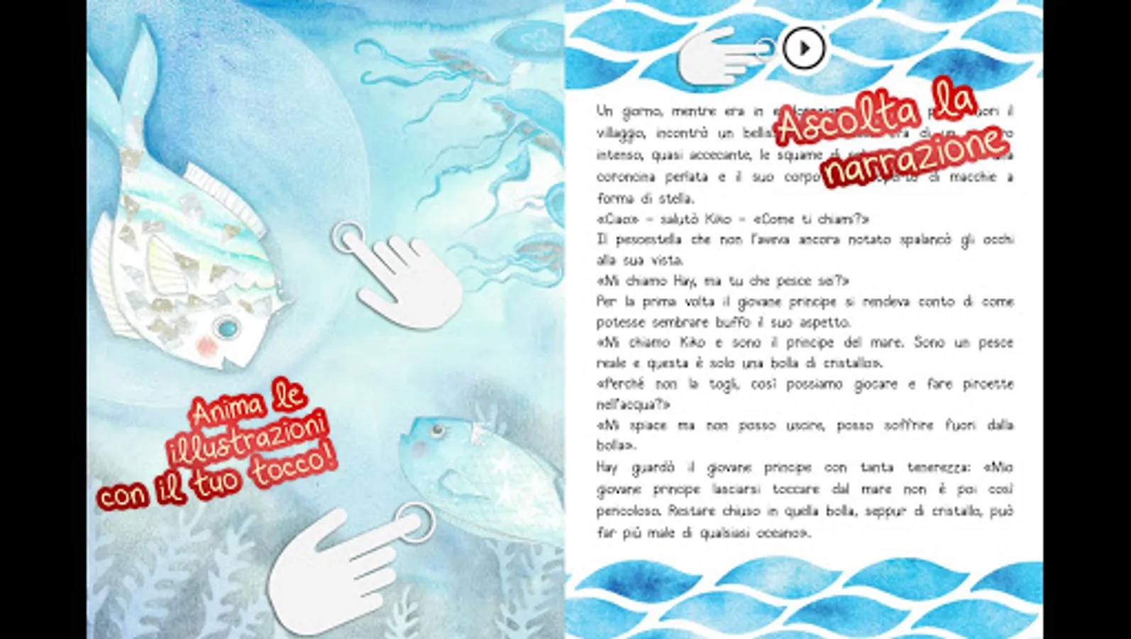 The story of a beautiful royal fish, Kiko the prince of the sea, forced by an excessive sense of paternal protection to live in a crystal bubble, which protects him from dangers but at the same time separates him from the beauty of the sea, from its caresses, from the possibility of having direct contact with each other.