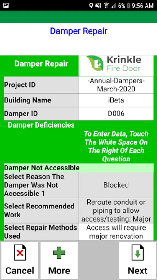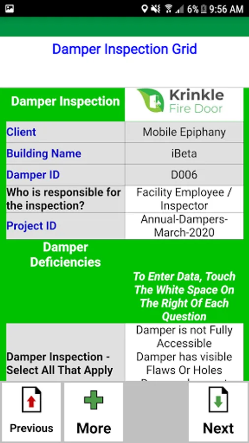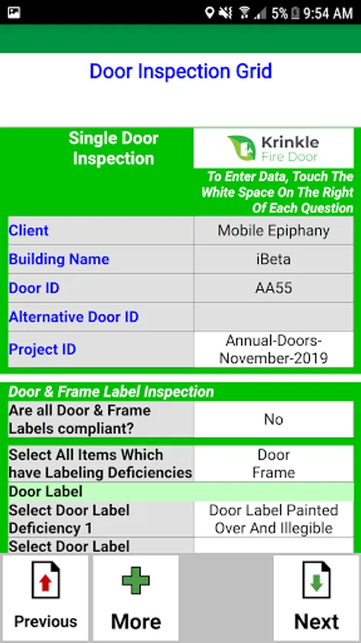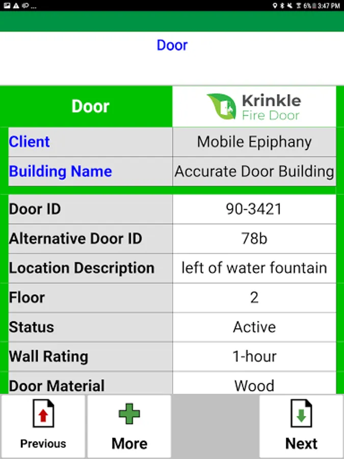 Krinkle Fire Door®️ is a smart mobile app that guides inspectors to easily adhere to NFPA 80 standards, speed up work, and automate fire door/damper reporting. The system tracks customers, buildings, fire doors, fire door frames, and fire dampers, as well as all associated inspections. An additional module even tracks the repair process associated with defects found in the inspections, including parts and labor costing.