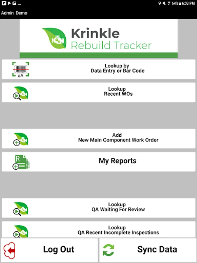 Krinkle Rebuild Tracker® is a shop floor mobile application and management reporting tool that will easily keep track of every stage of the rebuild process – from the arrival of the main component at the receiving pad, through disassembly, part level quality control, reassembly, testing, and shipping back to your customer. The data visibility which the system provides to management is comprehensive and will keep data organized and at your fingertips from the start of the process to its finish.