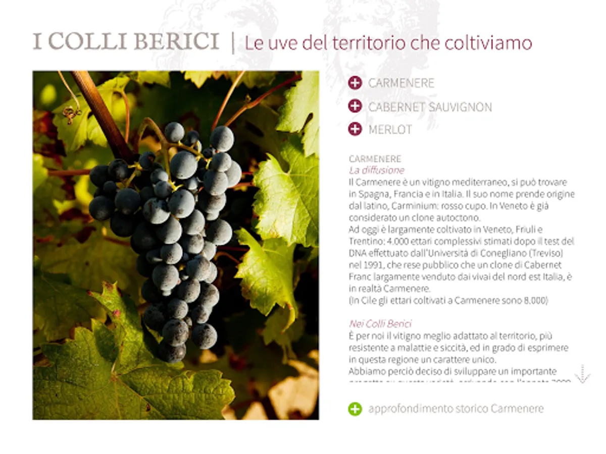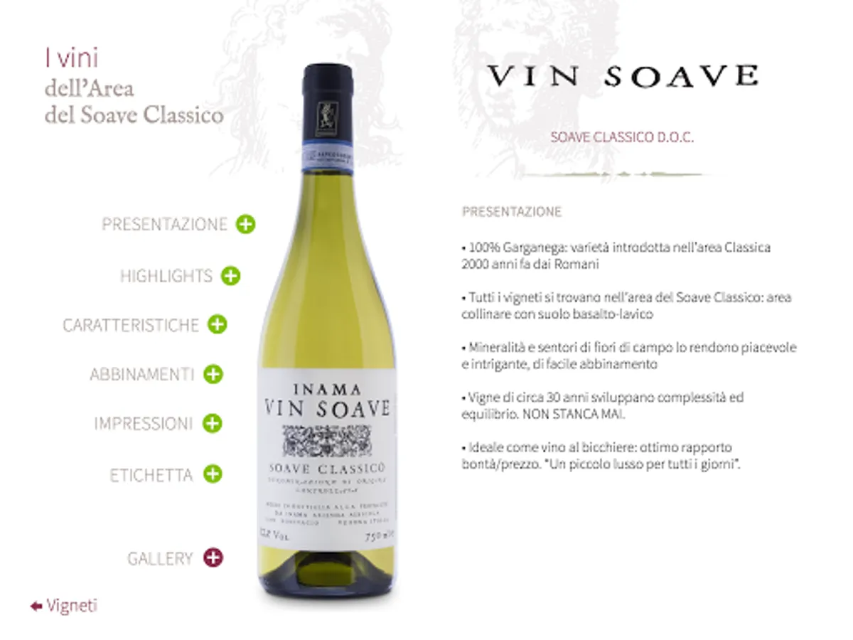 Company Presentation interactive Agricola Inama that guides you to discover, through descriptions, maps, images and video, the company history, its philosophy, the territories where they are produced wines. For each of them, produced in the Soave Classico and in the Berici Hills, it is presented an exhaustive description of the features.