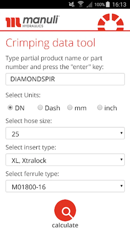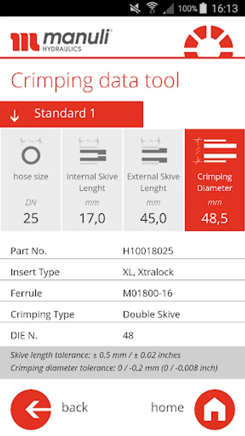The Manuli Hydraulics crimping app provides the most up-to-date crimping information for the entire range of hydraulic and refrigeration hoses and their respective fitting solutions. In this app you can find one or more fitting solutions for each hose type and individual reference in the Manuli range. These include the Standard 1 and Standard 2 solutions along with any alternative solutions available.