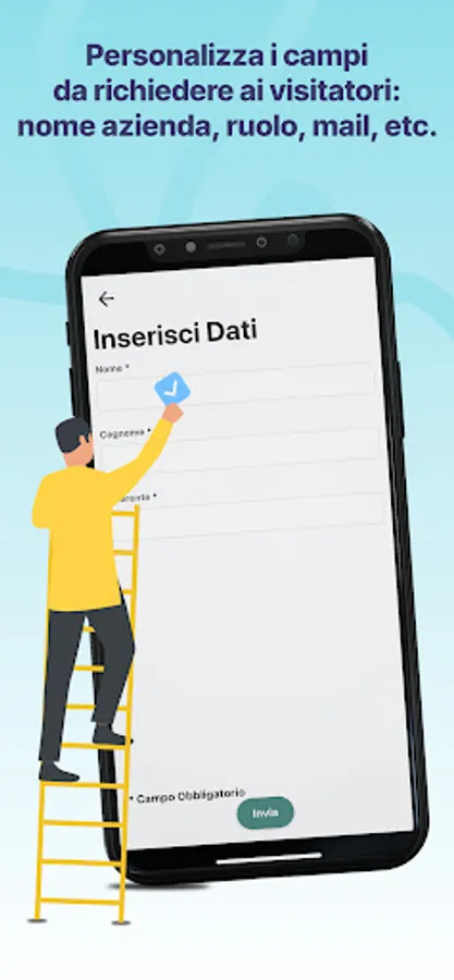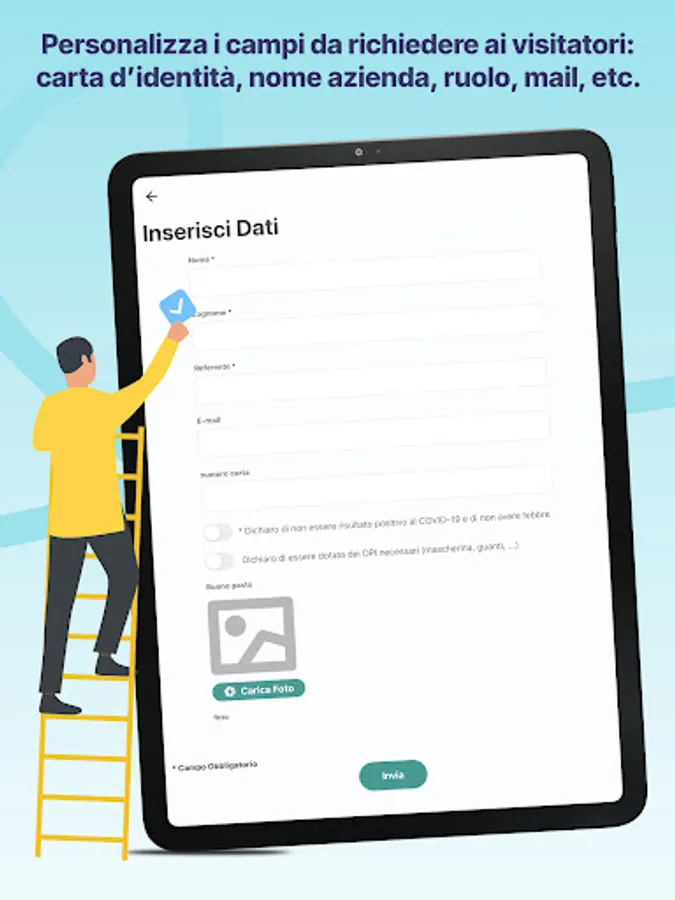 Customize the fields you require your visitors: ID card, company name, job title, email, phone, etc.