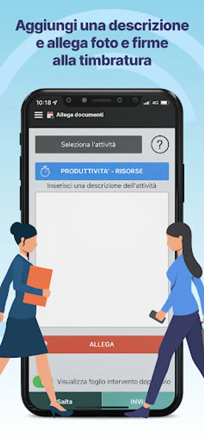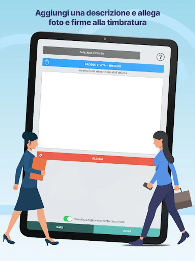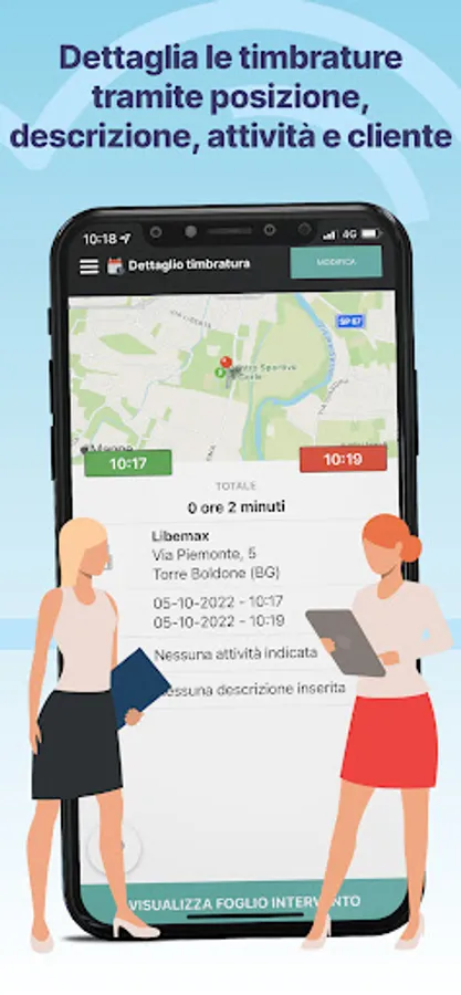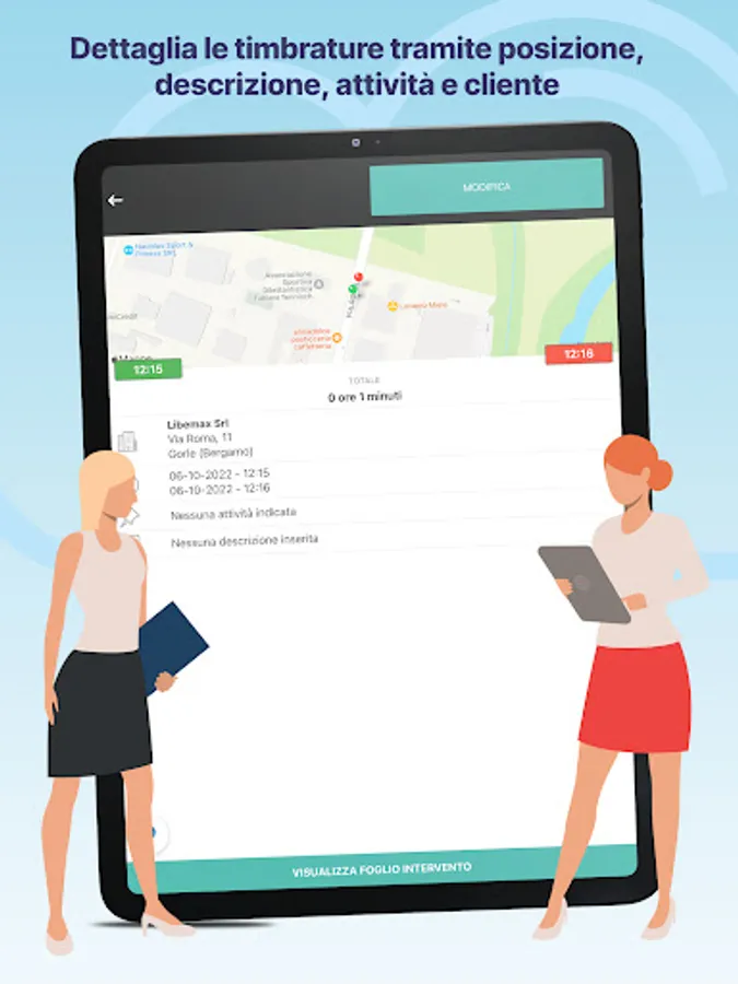 By making the clock-out, it is possible to enter a description, attach photoc, customer and operator signatures. Automatically retrieves the location and sent to your Admin panel.