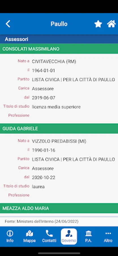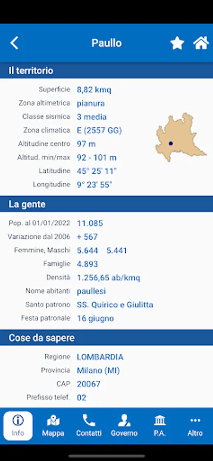 - geographic, demographic data and various references (contact details of the municipality, patronal feast, official website, etc.);