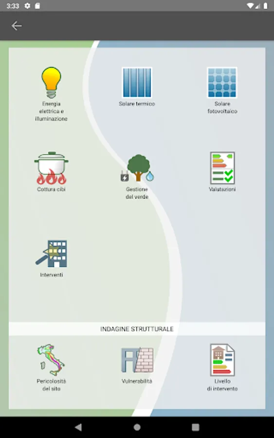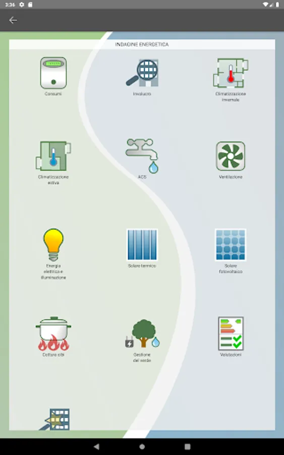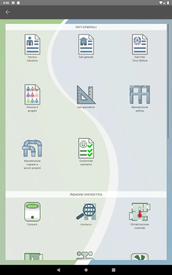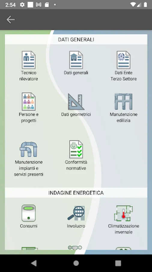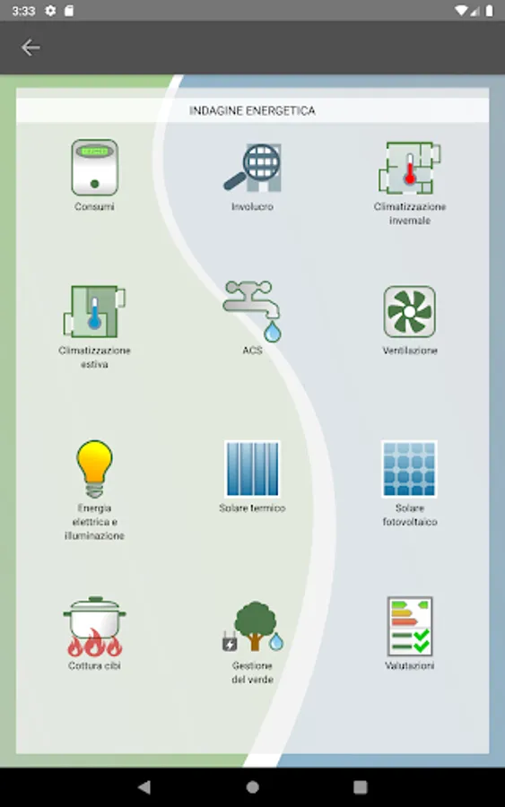 Within these sections there are all the various aspects to be detected, grouped in graphic form by means of icons and by type of data to be entered. By filling in the input data required in the different sections of the application, the final results are obtained: