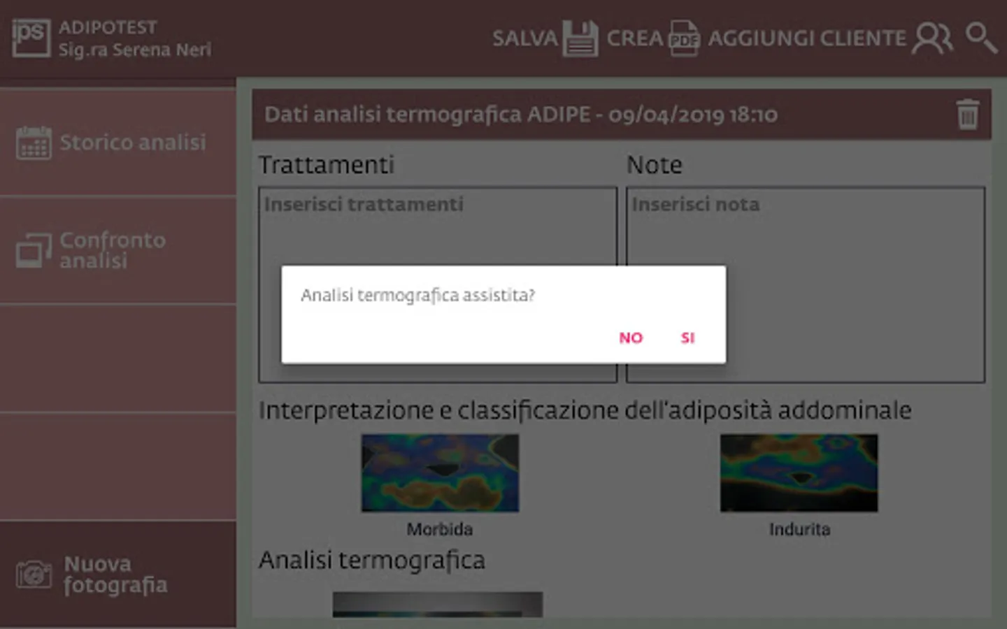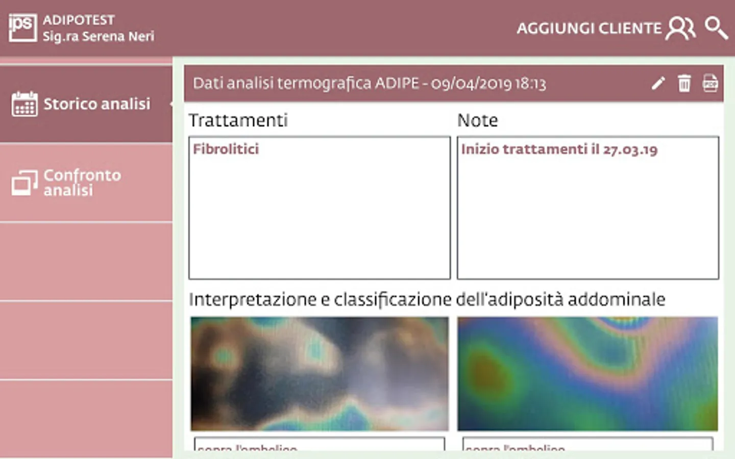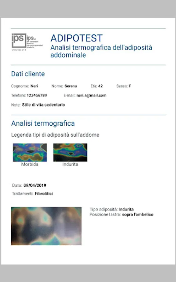 ADIPOTEST AI – a simple and intuitive app for the thermographic analysis of abdominal fat. Install this app on your tablet to enter customer data in a digital archive, to save thermographic images in customer cards, to get immediate help in assessing the type of adiposity. Review the thermographic tests carried out previously, compare BEFORE and AFTER treatment to demonstrate to your customers the effectiveness of your work and build their loyalty. Print and e-mail PDF files of thermographic tests.