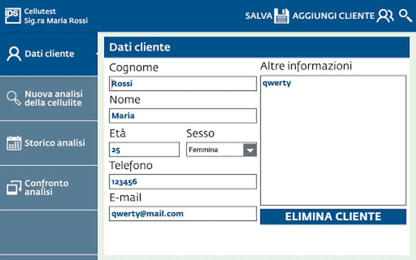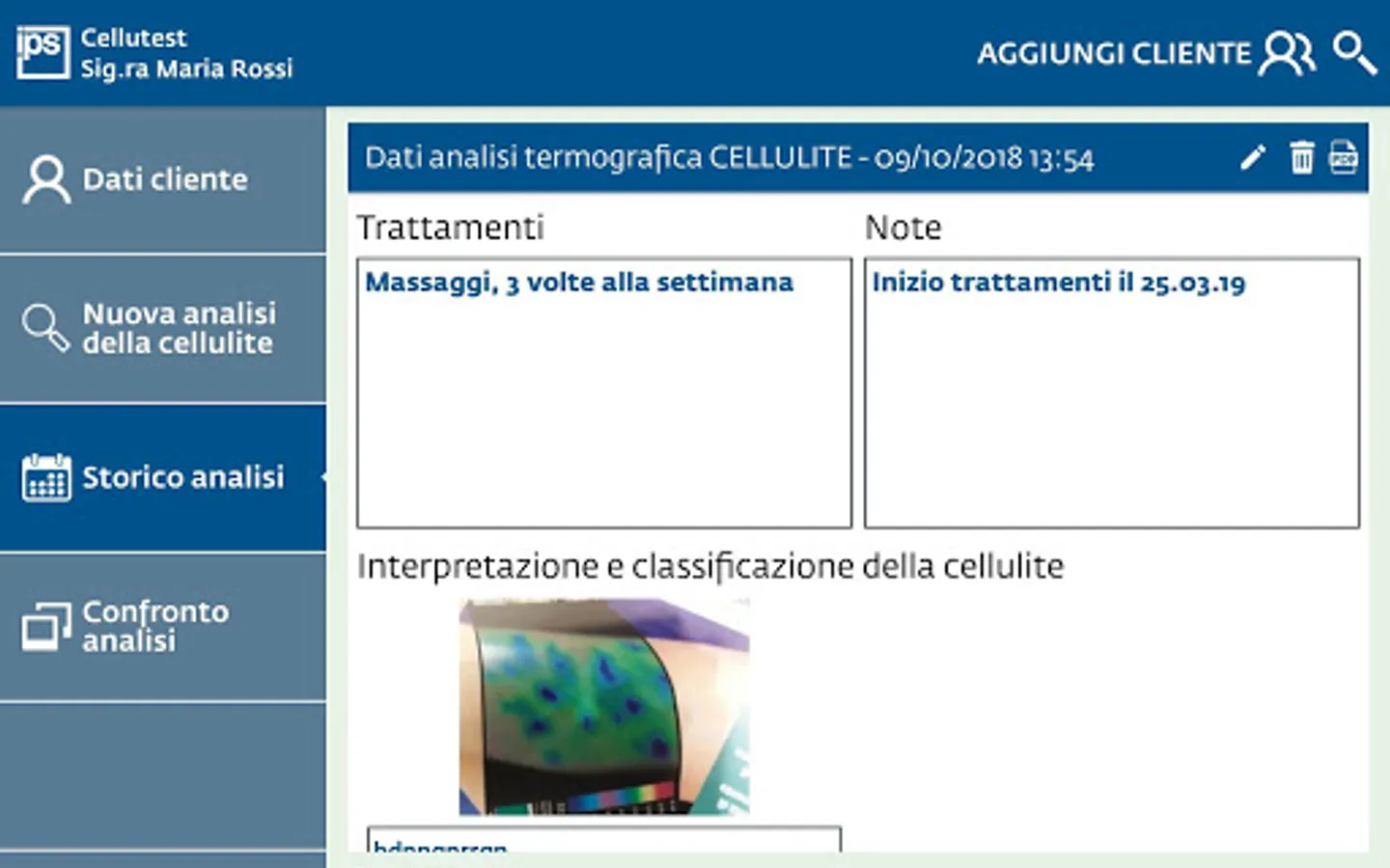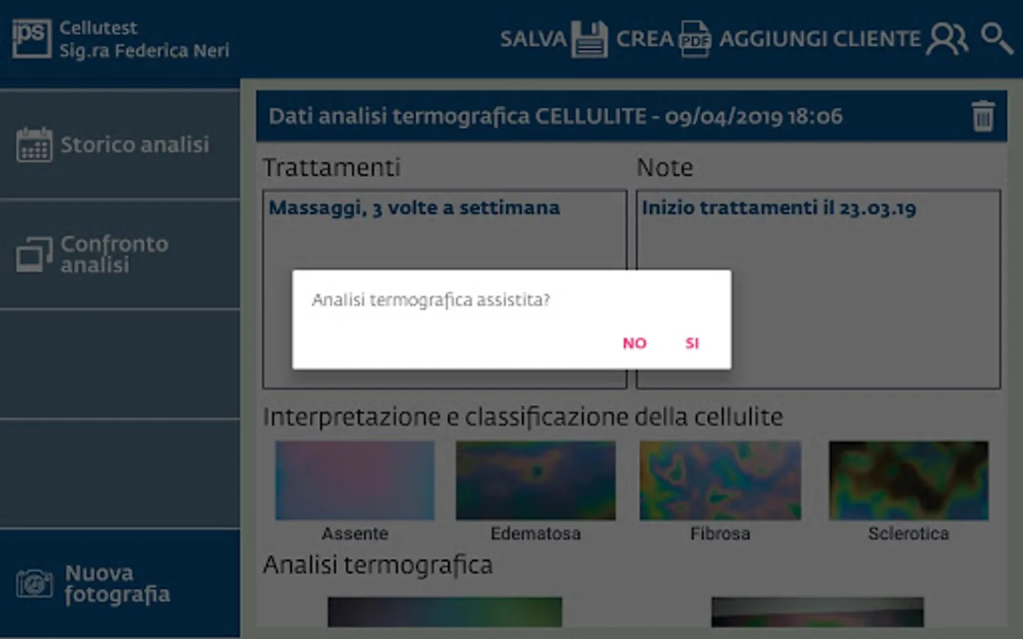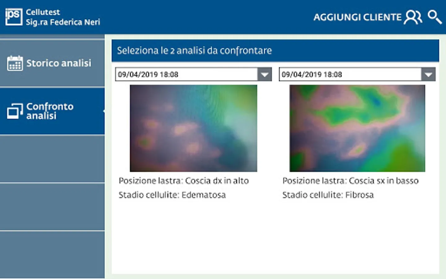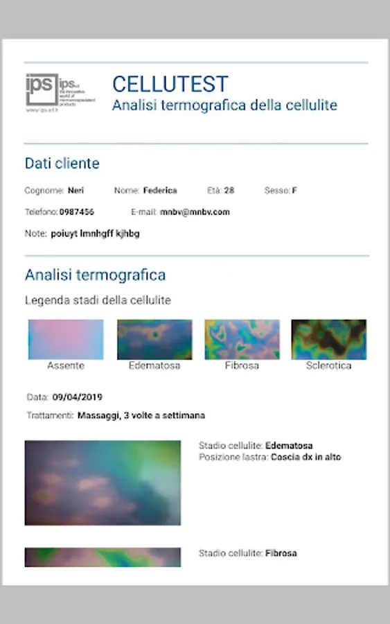 Cellutest AI – a simple and intuitive app for the thermographic analysis of cellulite. Install this app on your tablet to enter customer data in a digital archive, to save thermographic images in customer cards, to get immediate help in assessing the stage of cellulite. Review the thermographic tests carried out previously, compare BEFORE and AFTER treatment to demonstrate to your customers the effectiveness of your work and build their loyalty. Print and e-mail PDF files of thermographic tests.