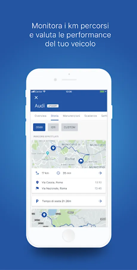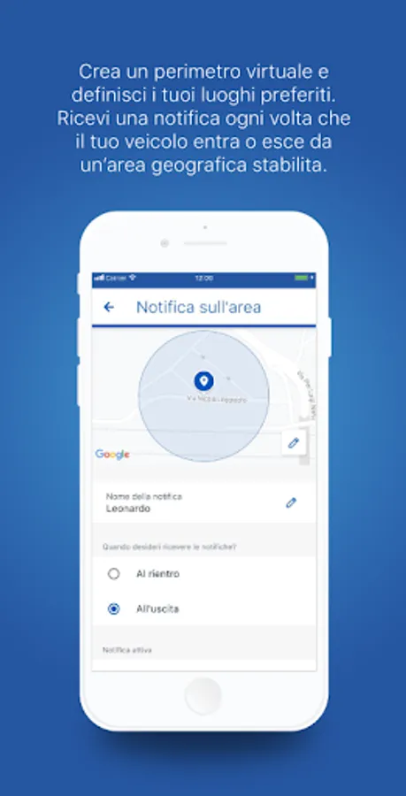 Once the area has been defined, you can receive a notification every time the vehicle enters or leaves the established geographical area. You can decide whether to ALWAYS receive the notification; REGULARLY (e.g. every Monday); IN THE ESTABLISHED PERIOD (e.g. from - to).