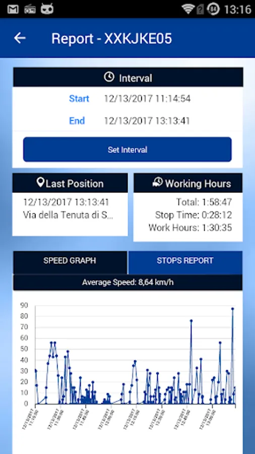 The App enables to track and localize the vehicle with the integrated device in real-time, verifying routes history; blocking ignition in case of theft; verifying maintenances and deadlines. Through the Report section, it is possible to analyze stops, routes and speed.