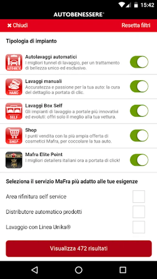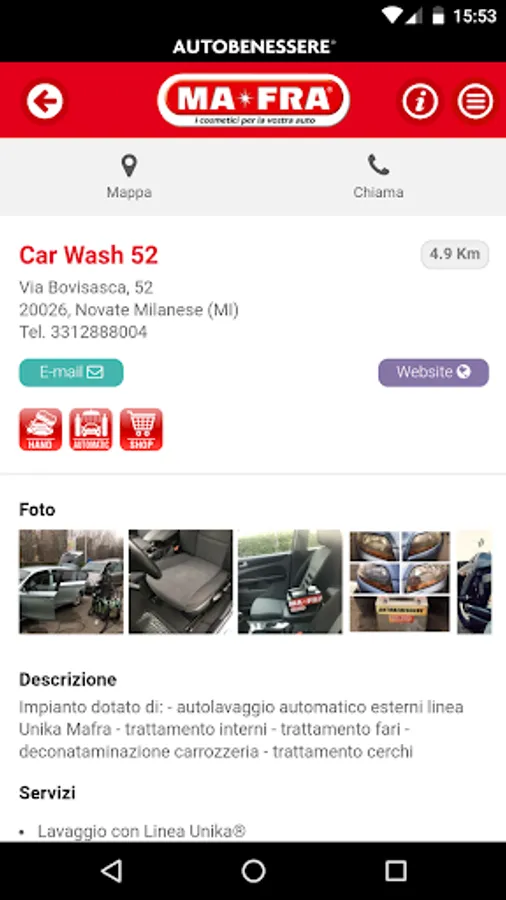 Thanks to the app you will have easy access to the best Autobenessere washing facilities, retail outlets and detailing centers nearest to you carefully selected for you by Mafra, a leader in products for care and maintenance of the car industry.