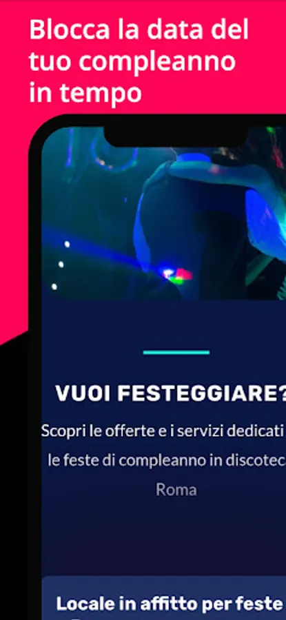 Browsing the app you will see images of the loale showing our lighting system, several large screens, the 4k video wall, our equipped bars, the wardrobe, the DJ console, the relaxation areas with private rooms, tables and comfortable sofas.