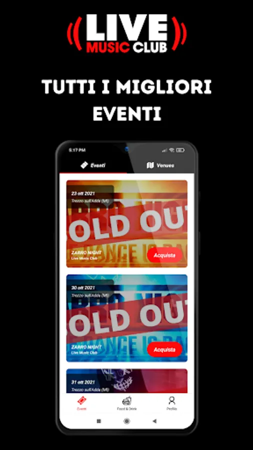 Live Music Club in is an App that allows users to order food and drinks using their smartphone within the Live Music Club arenas. The application also allows you to pay online for what is ordered and to buy tickets for events at the inside the Live Music Club arenas