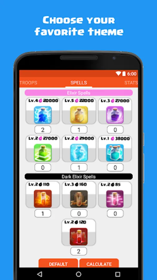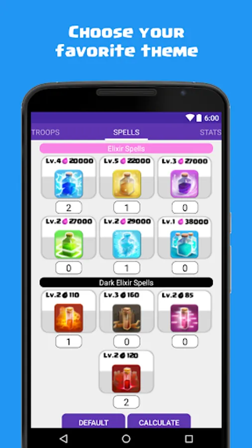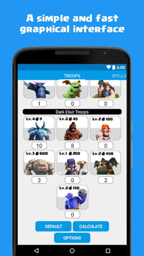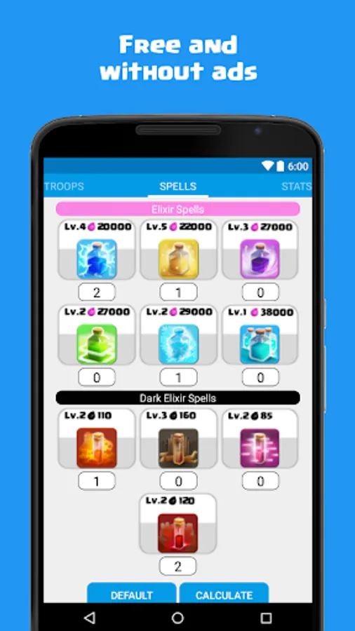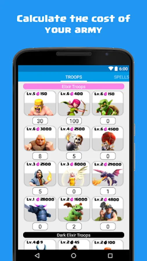 "Calculator for Clash of Clans" is an unofficial application, completely FREE and without the presence of any type of ads that will help you easily calculate the cost of your army (troops and spells).