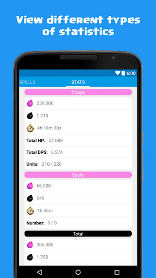 • Detailed statistics for each troop and spell