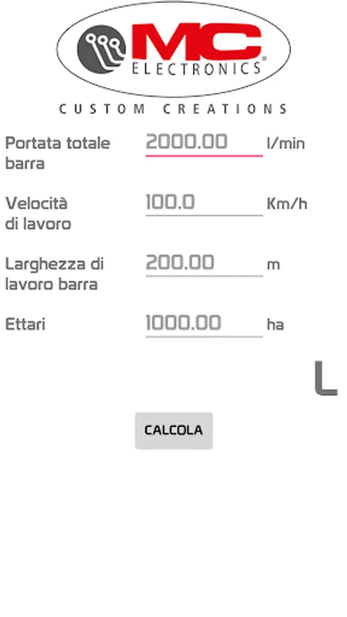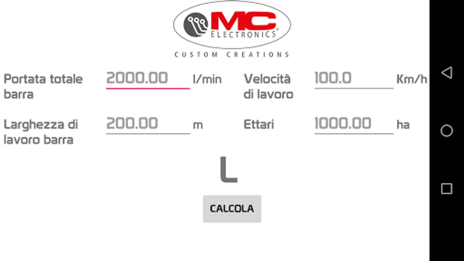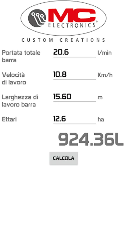 The application takes care of in a theoretical way to calculate the consumption in liters of a sprayer bar. And 'essential to know: (1) the speed of the sprayer; (2) how many hectares will be sprayed; (3) The flow rate in liters / minute of the bar; (4) The size of the spraying bar in meters.
