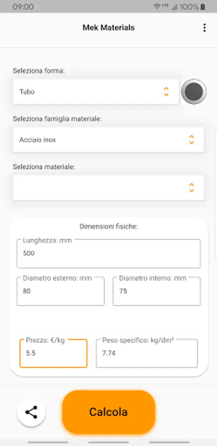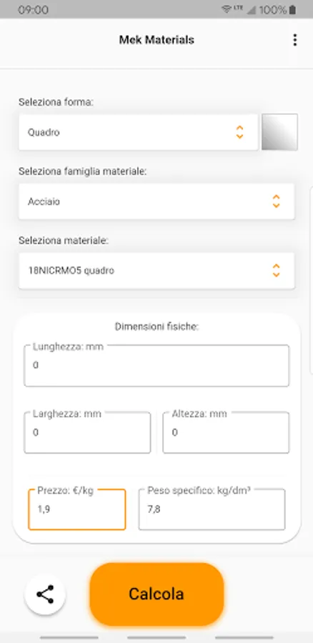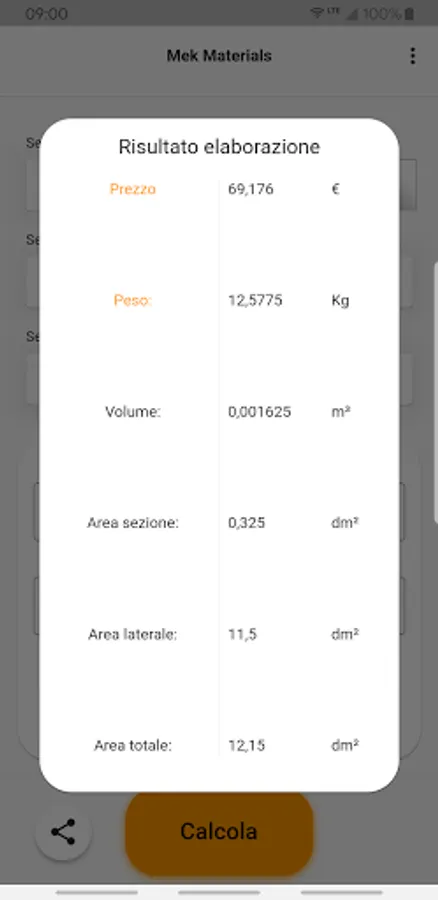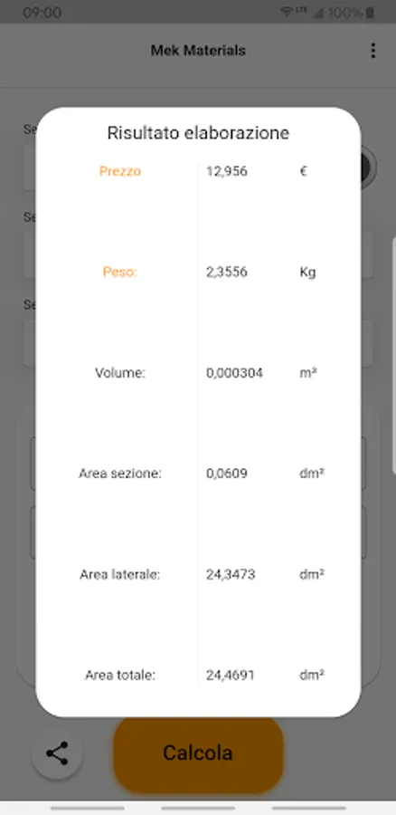 Select the type of material, define the dimensions: the result of the calculations is the volume, the area all surfaces and the price of the material.