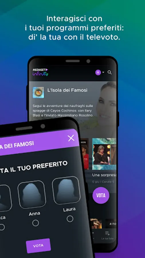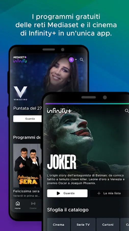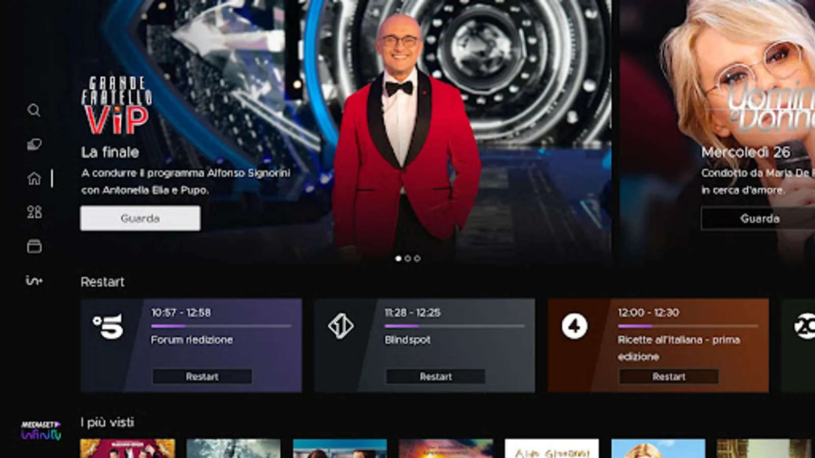The new Mediaset Infinity app has arrived for your TV. A free app, with advanced features and many exclusive contents, where you can find all the best of the Mediaset world, from complete programs to video pills: Entertainment, Fiction, Kids, Information, Sports, Documentaries and much more, to accompany you in all your moment.