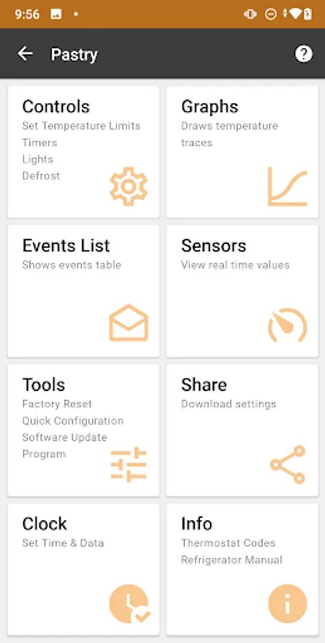 INFO: shows the fridge and thermostat identity and allows to receive the fridge user manual