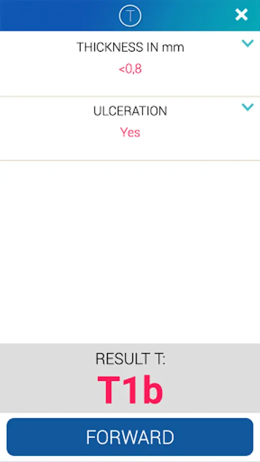 By simply selecting items from a drop-down menu, set according to the criteria of the AJCC tables, MelApp also allows you to identify the three T-N-M parameters.