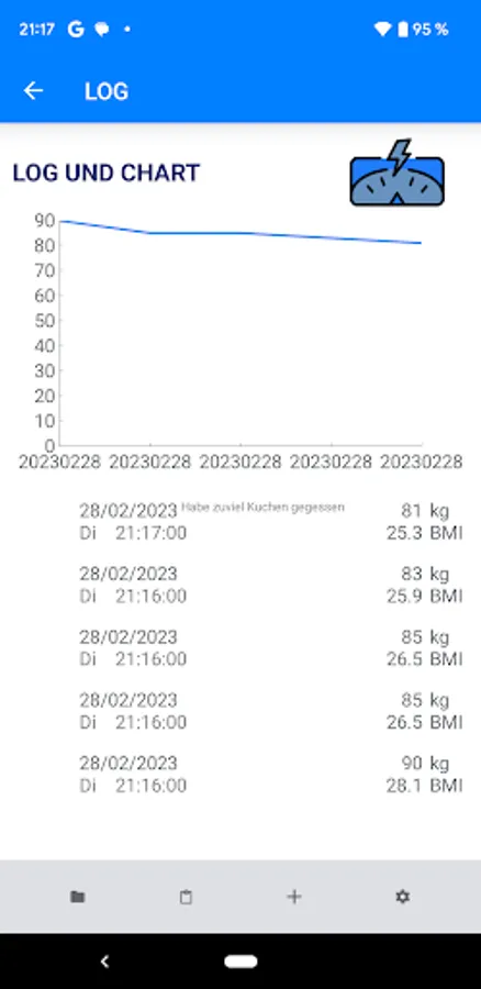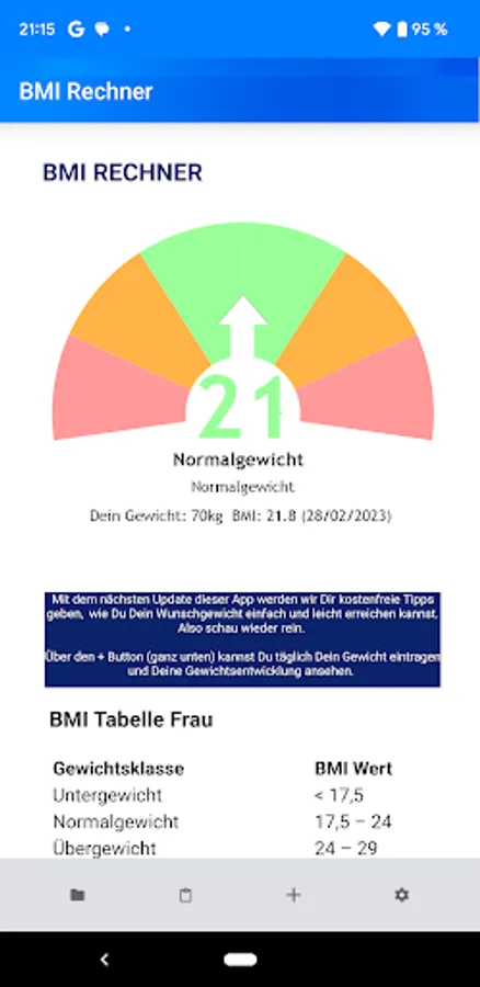 This BMI calculator (Body Mass Index Calculator) takes age and gender into account and recalculates the BMI by entering the weight every day. The Creff value is also determined. The weight diary and the chart as well as an easter egg are also available.