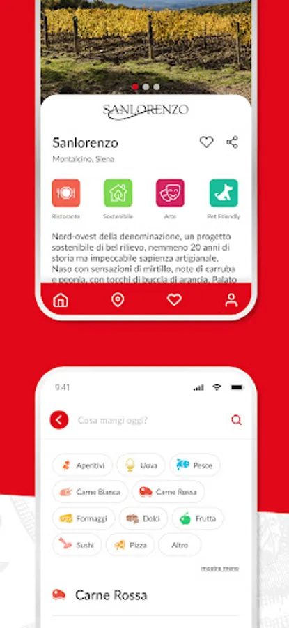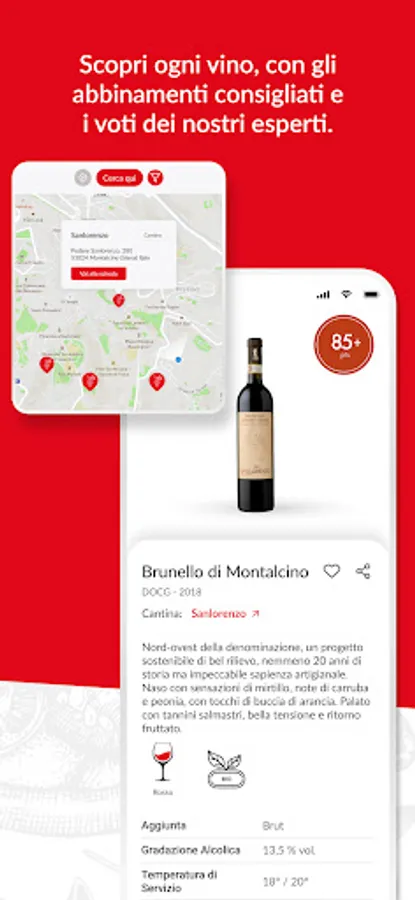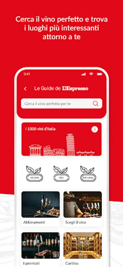 GUIDEESPRSSO will help you choose the right wine based on your tastes and the foods you choose thanks to a database of over 1,000 wines carefully selected by Luca Gardini, one of the leading experts in wine tasting and awarded as the best sommelier in the world. Thanks to the scores and its tasting notes you will have the complete cards at your fingertips and you can quickly save your wines or even your favorite wineries among the 500 selected throughout Italy.