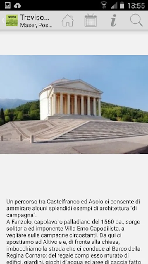 Treviso Official Mobile Guide is the official tourist guide to accommodation, restaurants, attractions, local products and tourism services in the province of Treviso. This edition, updated in the graphics, structure and content, has been produced and published by ME PUBLISHER-Mazzanti Apps in collaboration with Treviso Glocal Scarl and Unioncamere Veneto.