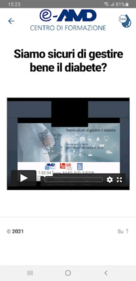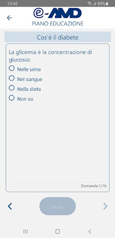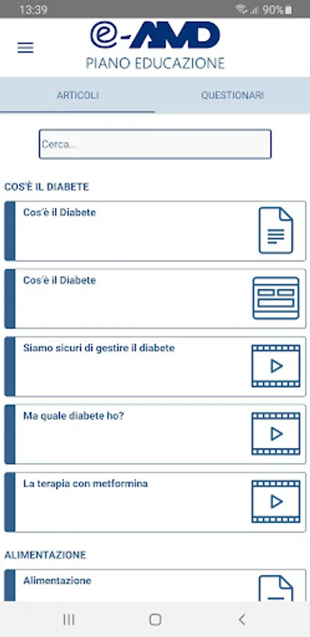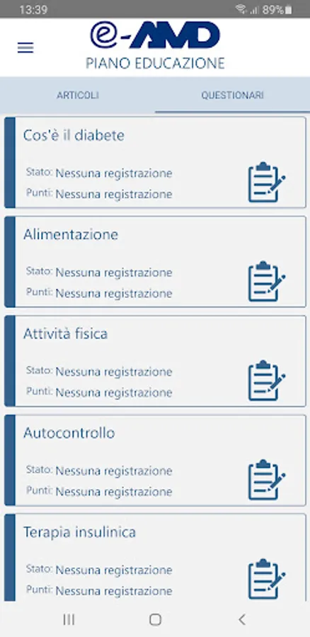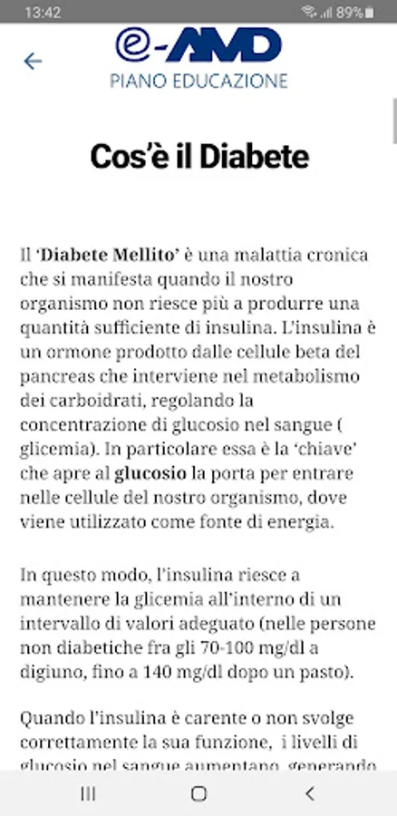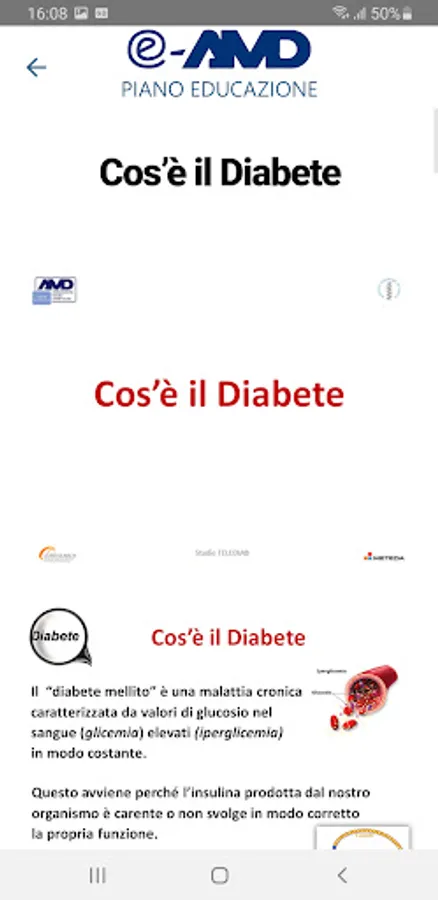 It is divided into a collection of questionnaires concerning the most common topics that a diabetic must know and in a clinical diary, where the person with diabetes can record the therapy taken, the laboratory data in his possession and text messages. The questionnaires (what is diabetes, self-control, physical activity, hypoglycemia, diabetic foot ...) with the relevant correct answers and specific educational insights - in the form of texts or slides or videos with audio - are available to the diabetic and can be consulted freely.