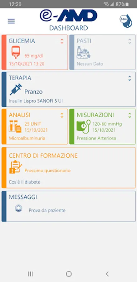 The app, if the user so wishes, can ask the technically provided diabetologist to be able to send the laboratory data collected by the diabetic himself to his folder, together with short text messages.