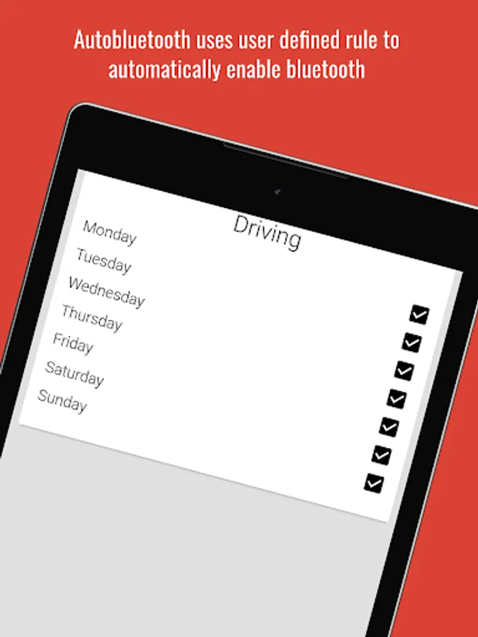 Driving: User specify in which days of the week BT have to be activated while driving a vehicle.