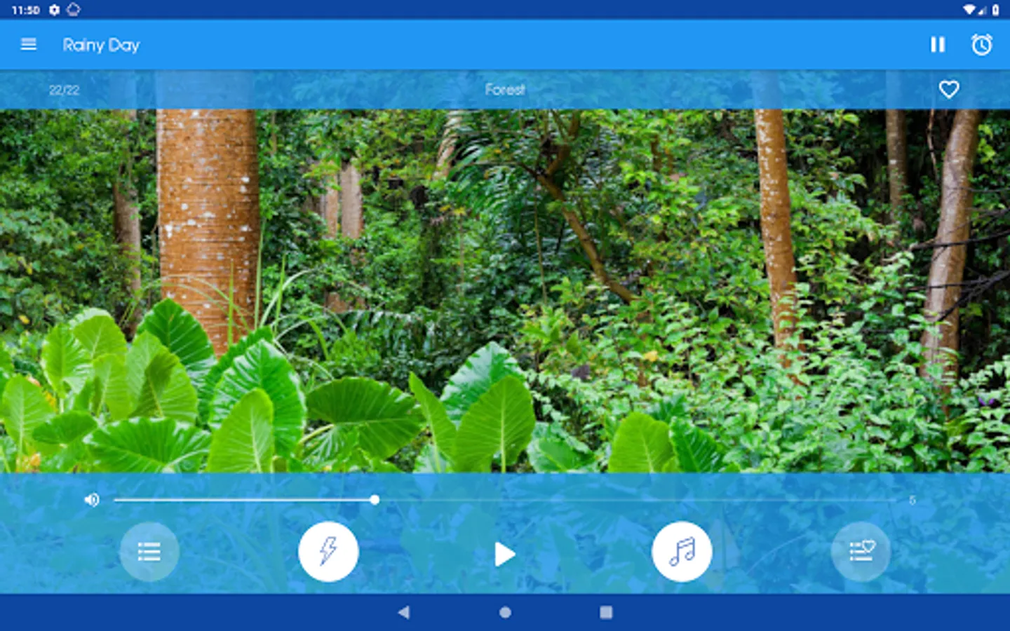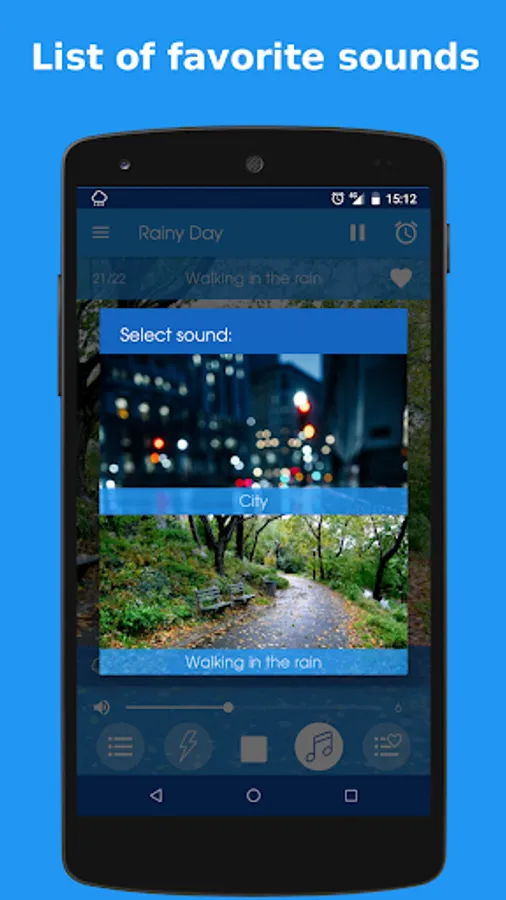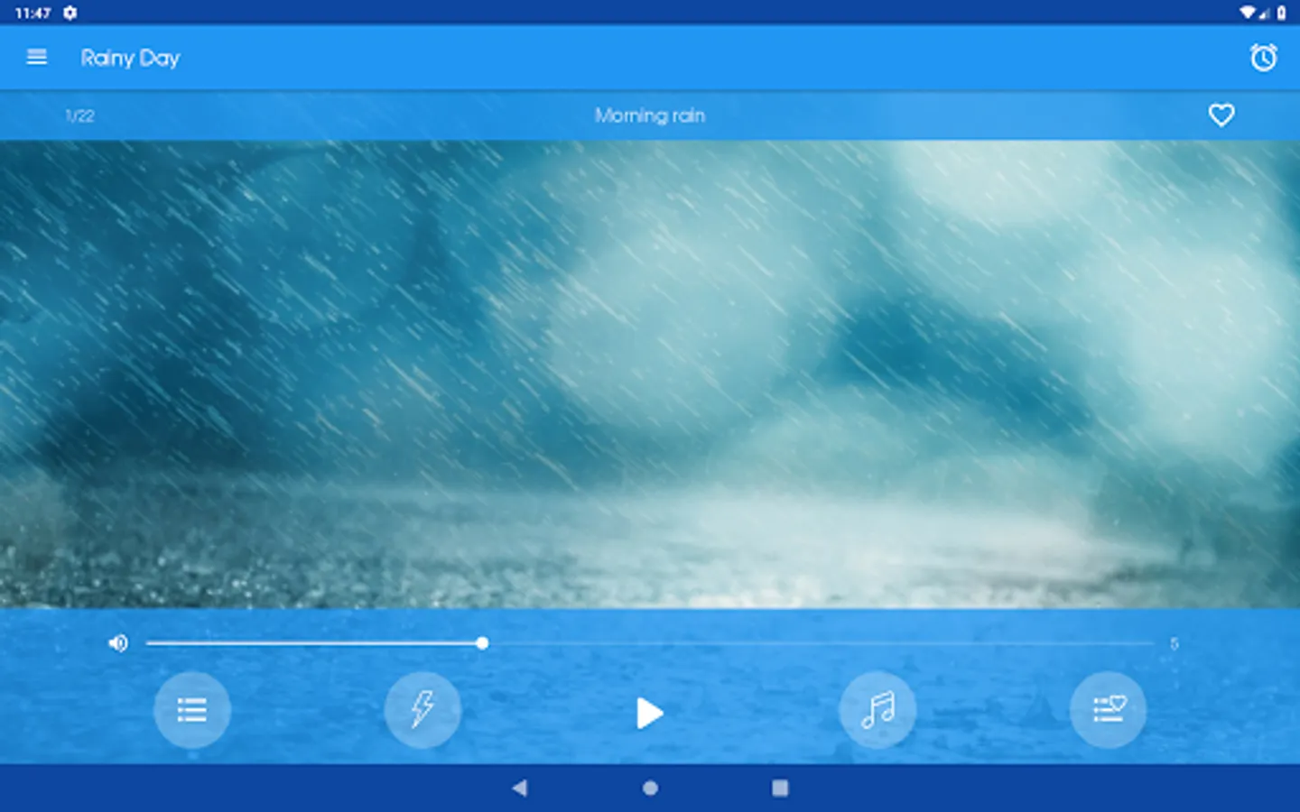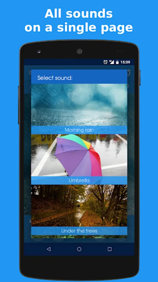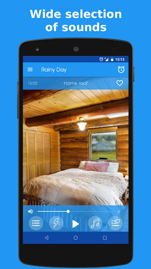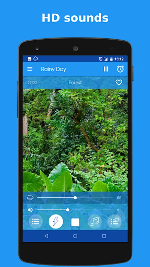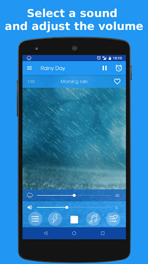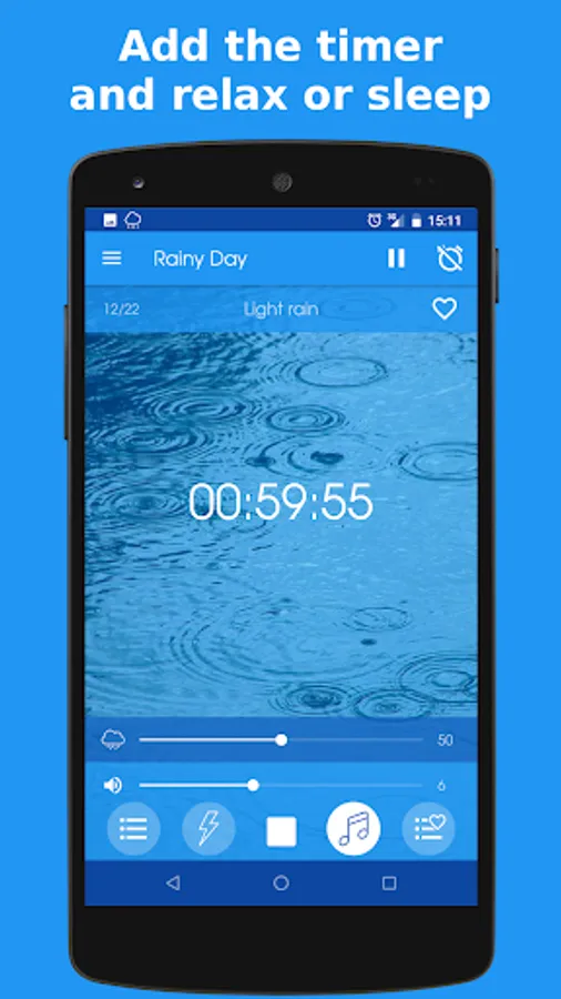 Select a rain sound and, optionally, a thunder and/or a relaxing music. Then you can adjust the volumes individually to find the ideal combination and so encourage a deep relaxation of the mind.