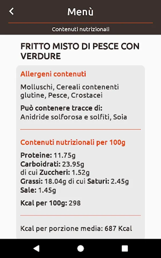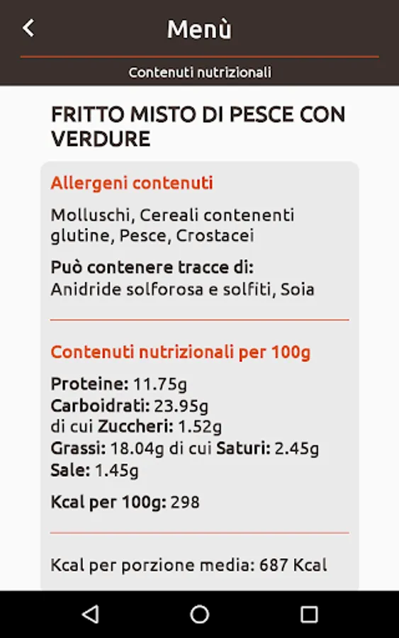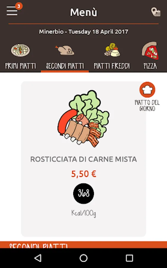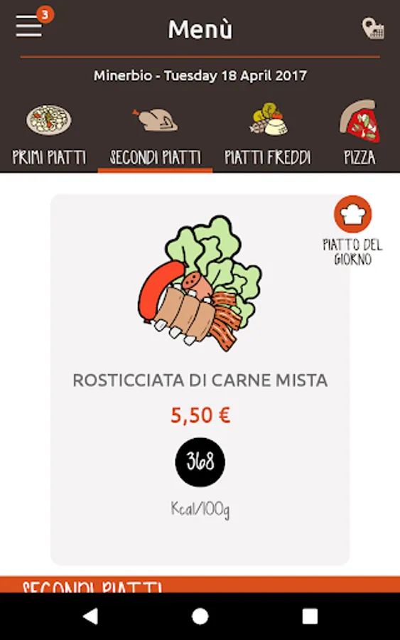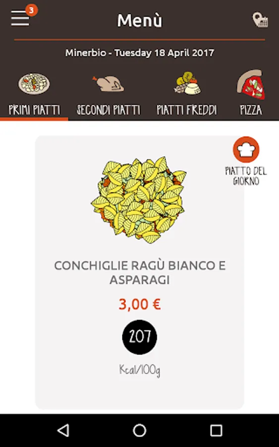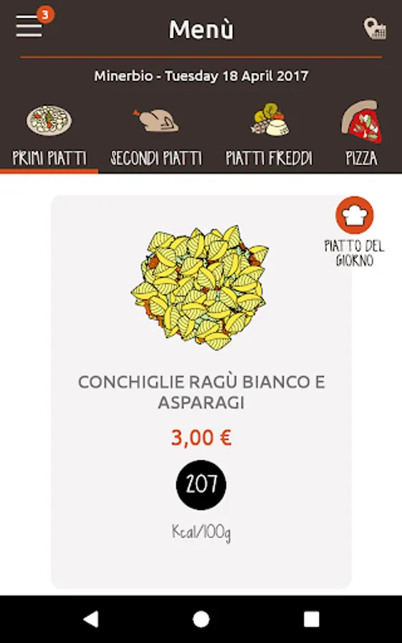 By selecting the date you can access the menu of the day in the selected restaurant. It is divided by type of course: Hot First Courses, Hot Second Courses, Cold Dishes, Side Dishes, Pizzeria, Fruit & Dessert. Now you can view the menu of the day, scrolling comfortably from one type of dish to another. You will always find the "Dish of the day" in evidence and, for each different recipe, you can view the price and caloric intake. In addition, by consulting the details of the dishes, you have access to nutritional contents and allergens.