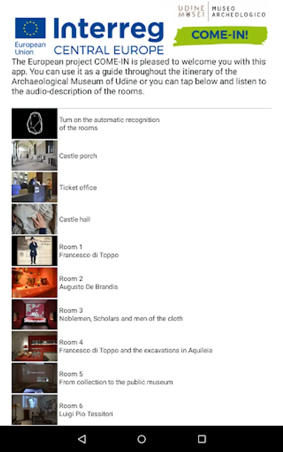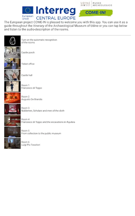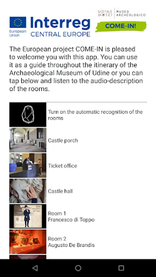 The European project COME-IN welcomes you with this application that you can use to be guided in the tactile path of the Archaeological Museum of Udine, or by making a selection you can listen to the audio description of the rooms.