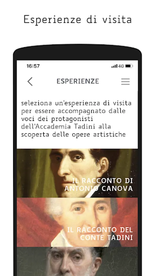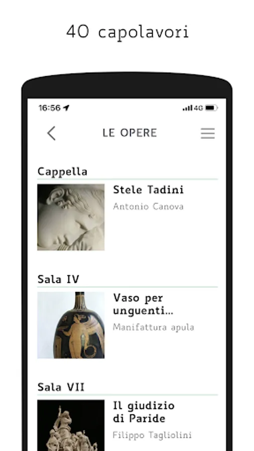 40 masterpieces of the Galleria dell'Accademia Tadini that you can discover through images, descriptive texts and audio guides. Scan the QR codes near the works, or browse directly on the app, to access multimedia content, put on headphones or bring the phone to your ear, find out all the details and let yourself be guided by the narratives.