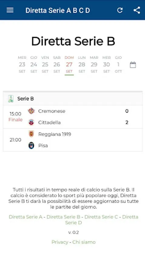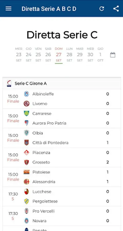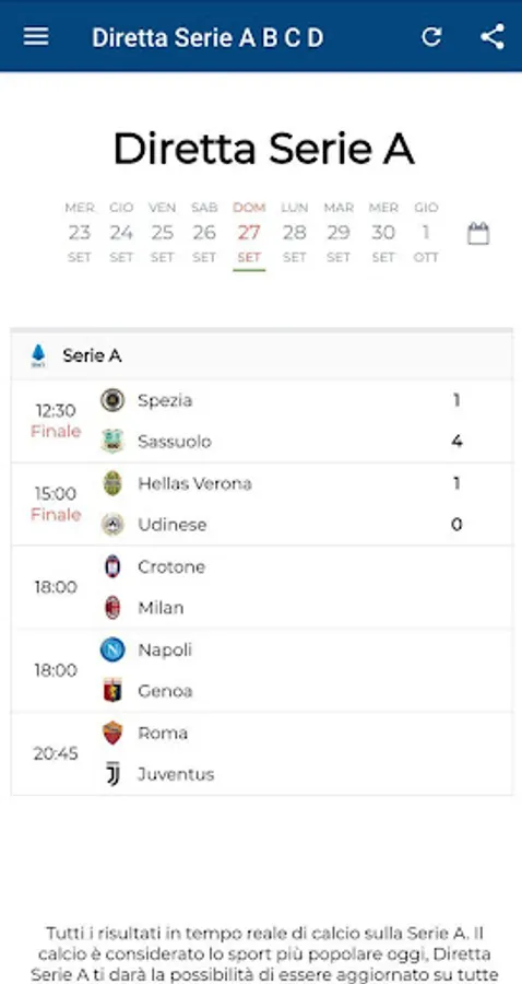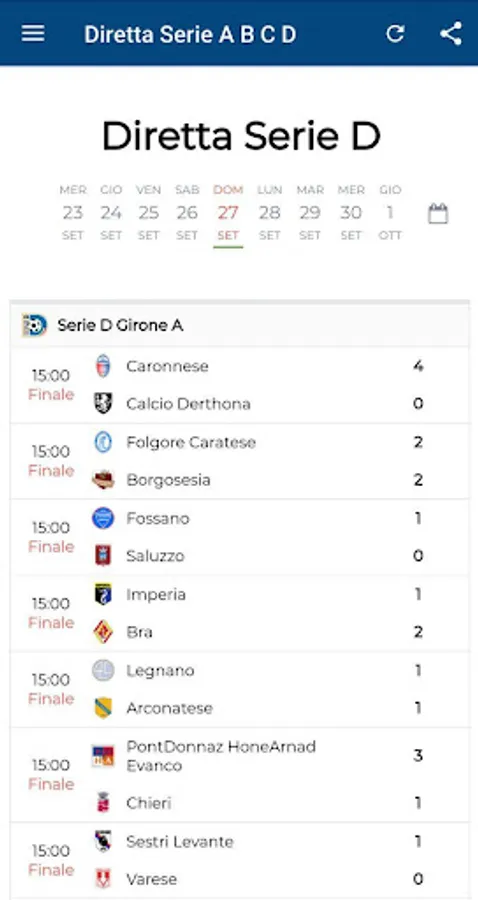 All the main Italian leagues live divided by day, read and easy to navigate with the ability to switch from one day to another intuitively. In addition to the results, you will have access to the statistics of the individual matches, with goalscorers and tables, where available. Access to rankings with statistical data.