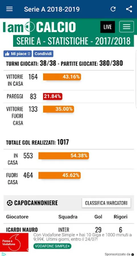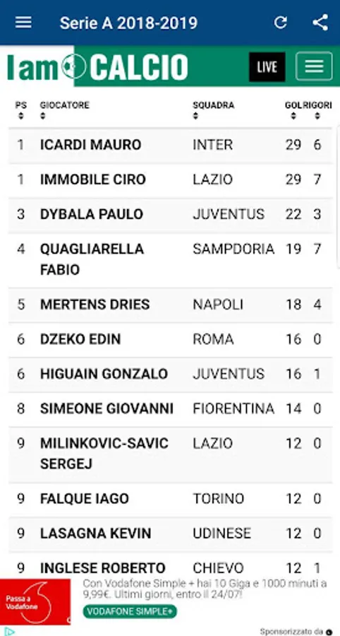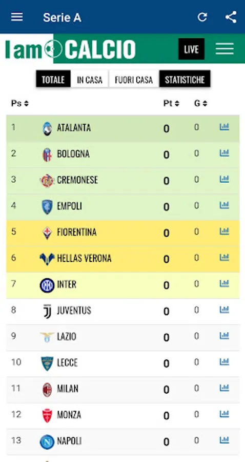 For a quick and easy view of the Italian top league standings with updated results, standings, statistics and goalscorers.