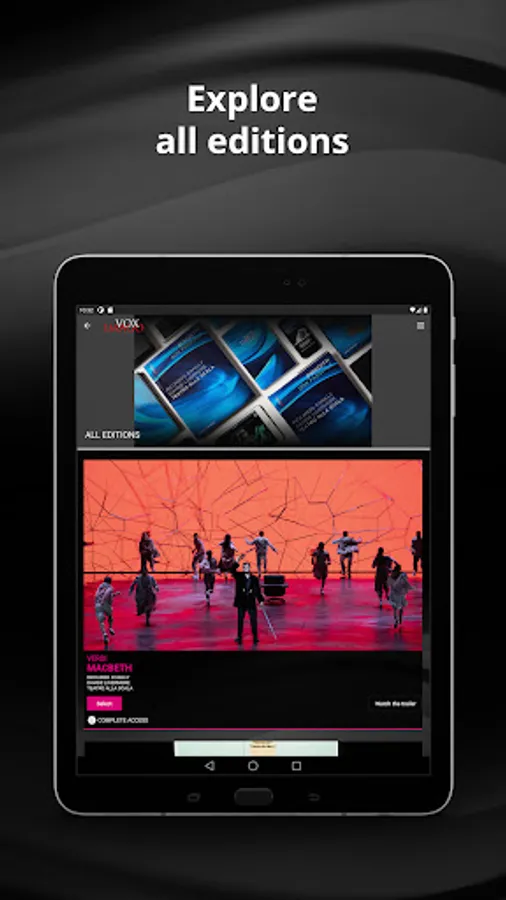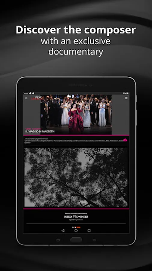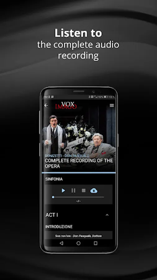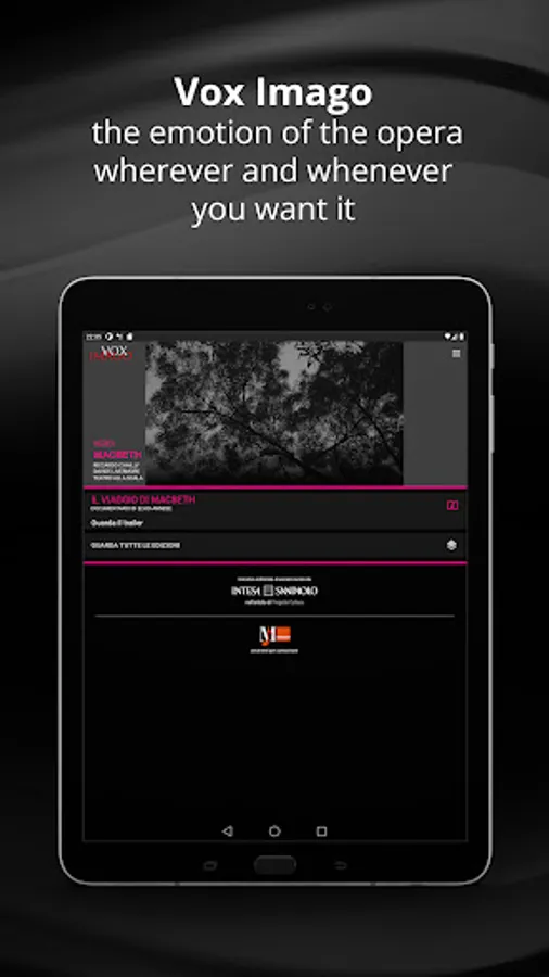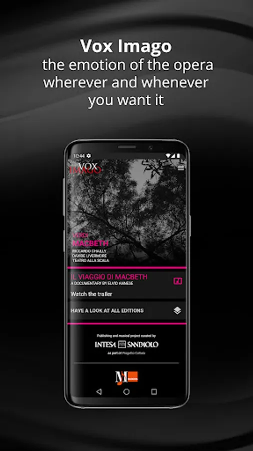 Vox Imago is a multimedia series devoted to spreading the knowledge of opera, curated by Intesa Sanpaolo as part of its Progetto Cultura (Culture Project). The project envisions the selection of one opera title each year, and consists of a digital platform proposing: a documentary, a video selection and complete audio recording of the opera, with its synopsis libretto, essays, insights and historical sources of the opera analysed in the issue.The edition is completed by a richly illustrated volume with specific essays and a cahier.