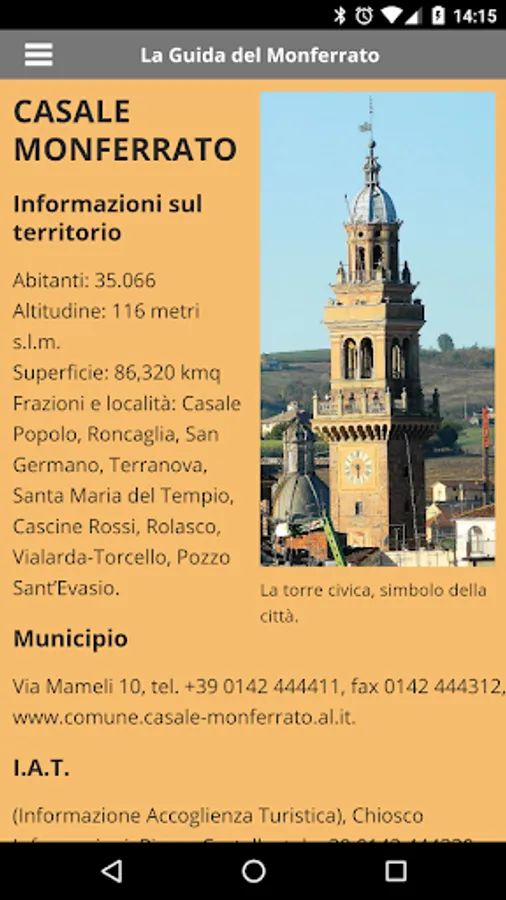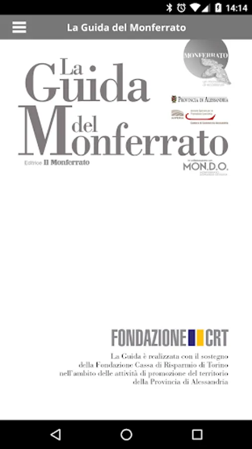 THE GUIDEBOOK OF MONFERRATO comes from the work of more than 60 employees of "Il Monferrato" - Local leading newspaper since 1871 and among the oldest in Italy. It contains all the news of the 55 municipalities of the enchanting Monferrato area and its historic capital, "Casale" . Thanks to GUIDE the visitor will be accompanied to the discovery of a path through history, curiosities and architecture, with information gathered by local newspaper reporters and collaborators who will allow you to discover the treasures and get all the directions for searching particular gourmet products and wines. the Guide was already successfully presented at the "Triennale di Milano" as a traditional book Guide, and it is now available on smartphones in Italian with English translation.