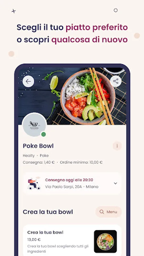 Mymenu the best restaurant, where you are. Choose what to eat and drink now, at home or in the office. Our menus offer from first course to dessert: made-in-Italy, overseas and gluten-free recipes. Order or collect immediately for the finger food aperitif with friends, for the impromptu vegetarian brunch with roommates, for the craving for raw food from colleagues or for your children's ice cream. We are active in Milan, Brescia, Bologna, Modena, Padua and Verona to make you look good when you have little time and to always pamper you with your favorite dishes. Pay with Visa, Mastercard, Postepay, American Express, Maestro, PayPal. Download the free app and eat now, whatever you like best.
