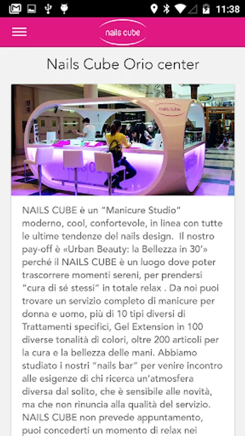 NAILS CUBE is a "Nail Studio" modern, cool, comfortable, in line with all the latest trends in design nails. Our tagline is "Urban Beauty: Beauty in 30 '' because NAILS CUBE is a place where you can spend quiet moments, to take" care of themselves "and relax. Here you can find a complete service of manicure for men and women, more than 10 different types of specific treatments, Gel Extension in 100 different shades of colors, more than 200 items for the care and beauty of mani.Abbiamo studied our "nails bars "to meet the needs of those who find a different atmosphere from the usual, which is sensitive to new things, but that does not renounce to the servizio.NAILS CUBE does not set an appointment, you can give yourself a moment to relax in our centers soon as you finish grocery shopping, or while you wait for your flight / train. We use only high-quality products; respecting the highest hygiene standards, we employ only highly qualified staff trained on one of our "" of lavoro.Cerca NAILS CUBE method in the shopping center near you or in stations and airports and discover our "Urban Beauty: Beauty in 30 '', please come!